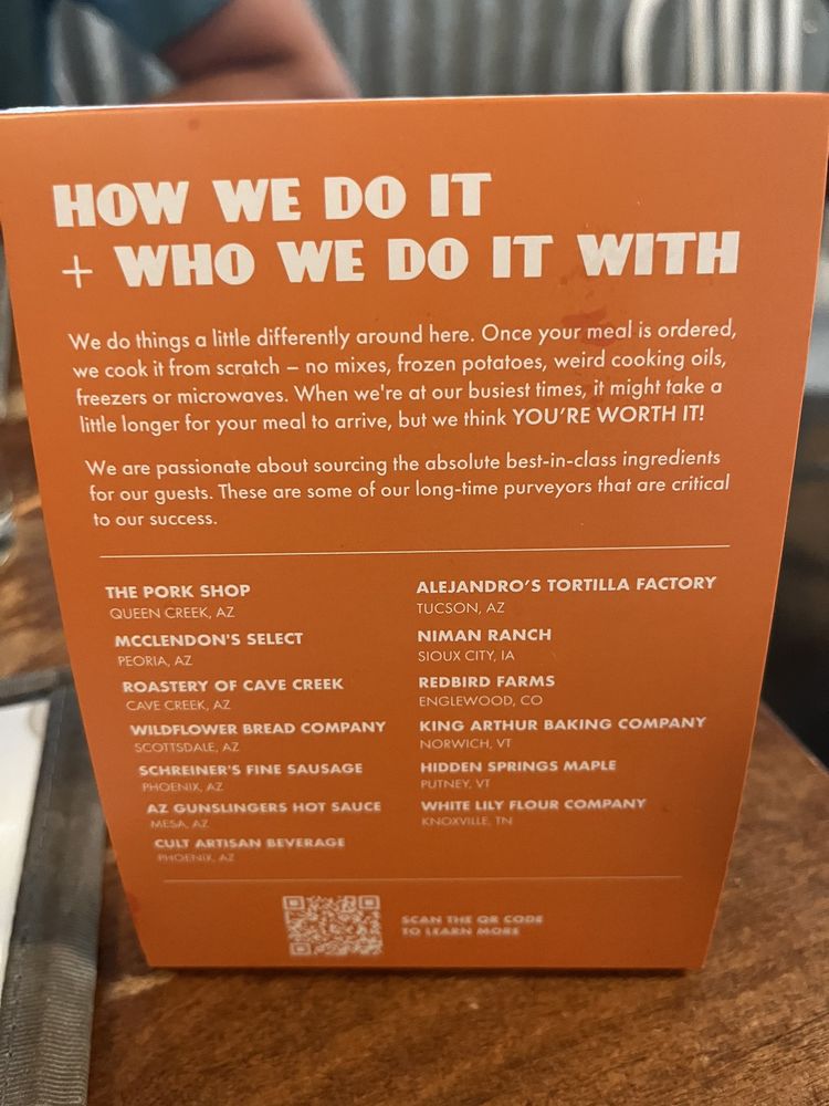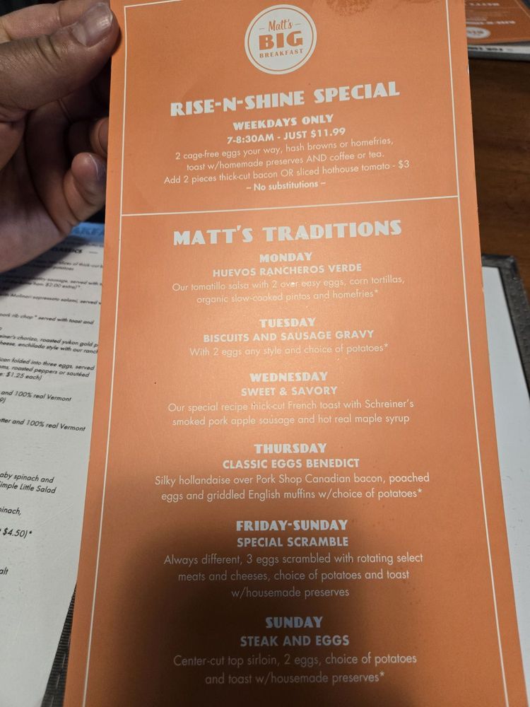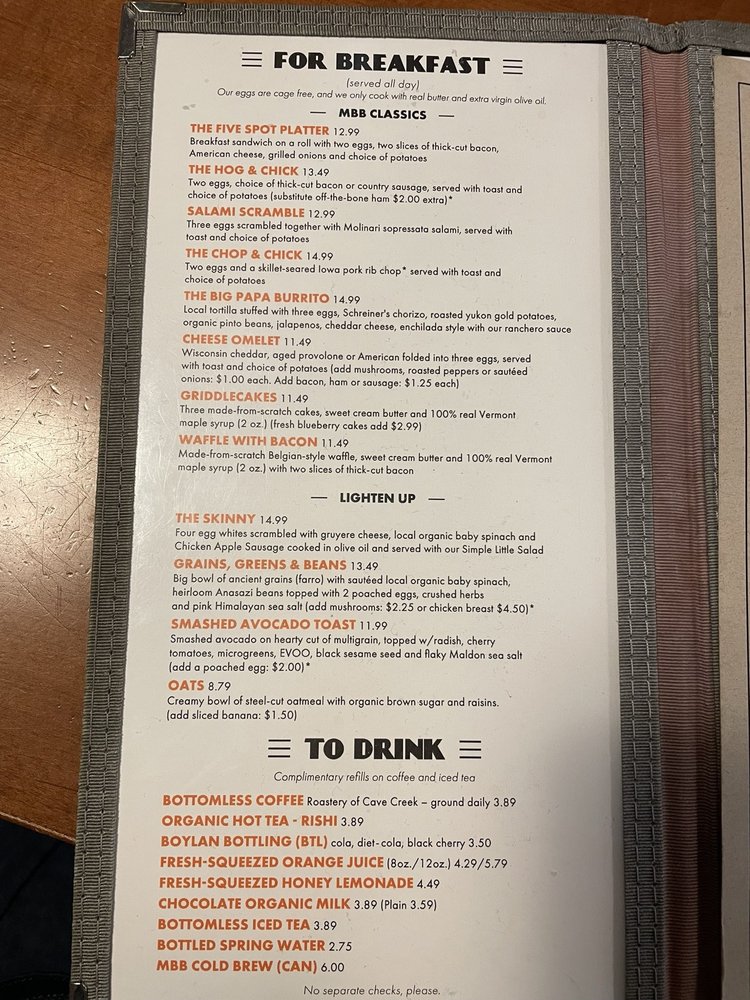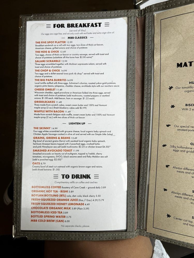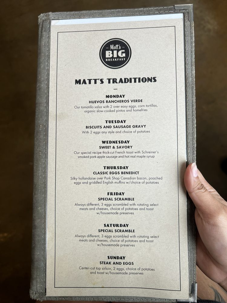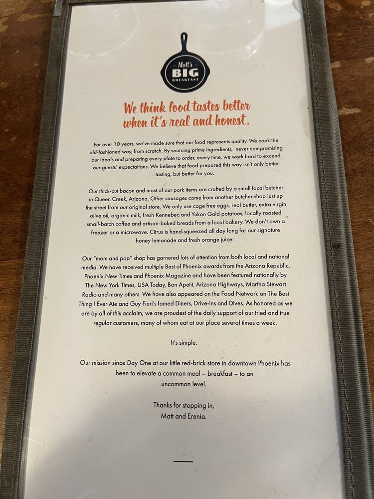Matt's Big Breakfast is a cozy American breakfast and brunch spot located in Phoenix, Arizona, offering a wide range of options for a delicious morning meal. They pride themselves on their fresh ingredients and homemade dishes, with a focus on quality and flavor. The menu features classics like cheese omelets and blueberry griddlecakes, as well as unique creations like the Grains, Greens, and Beans bowl. Don't miss out on their Weekend Special Scramble with applewood ham, a crowd favorite. Additionally, they offer a variety of drinks including fresh squeezed orange juice, organic milk, and cold brew coffee. The restaurant provides a comfortable outdoor seating area, making it a perfect spot for a leisurely breakfast.
